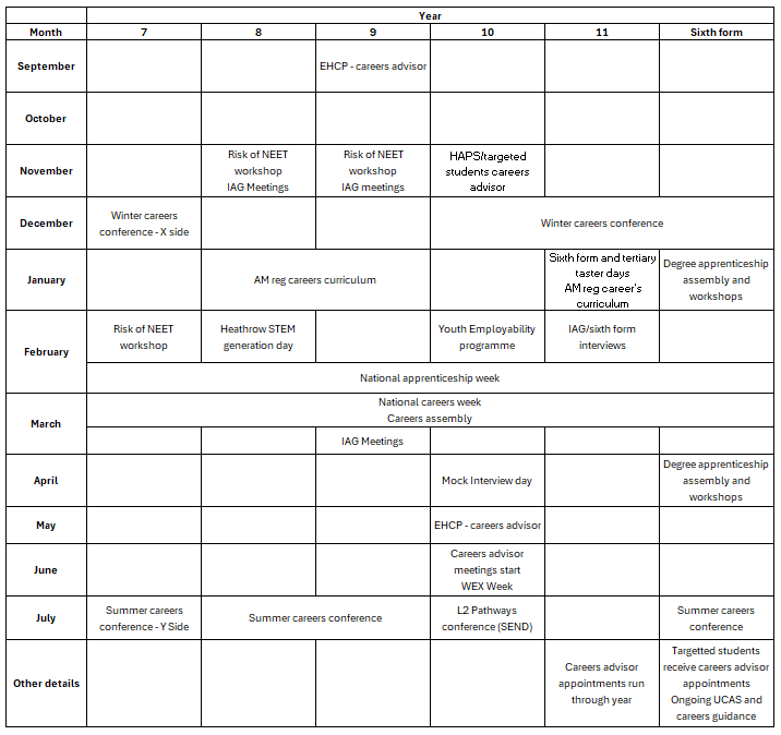 Throughout year 11 students are supported with their individual aspirations through guidance from a careers advisor. They will meet with a senior member of staff to explore their sixth form application and post-16 plans. Students have additional input on apprenticeships and vocational courses such as T levels ,and all Year 11 students receive additional careers input as part of National Careers Week.